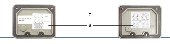 頂蓋是由耐氣候變化的鑄鋁合金制成,表層已涂色. 頂蓋部件上部有一個(gè)接線盒(圖4中1),在接線盒前面有一個(gè)放氣閥(圖4中2)和一個(gè)用悶蓋螺母(圖4中3)覆蓋的測(cè)試按鈕,同時(shí)上面還附有一個(gè)測(cè)試按鈕操作說(shuō)明標(biāo)牌(圖4中4). 接線盒中除了有一個(gè)接地點(diǎn)(圖4中5)外,頂蓋底板內(nèi)還裝有電力引線端子(圖4中6). 通過(guò)電力引線端子的數(shù)量可以決定涉及干簧管類型與數(shù)量的開(kāi)關(guān)系統(tǒng)的布線配置.